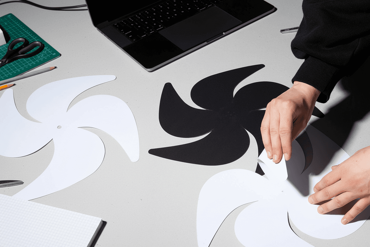 The fan is designed around a single paper blade, cut and folded, and delivered as a kit to assemble. The blade is removable and interchangeable, allowing the appearance of the fan to be changed by simply replacing the blade according to personal preference.